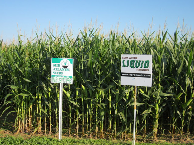 What was my fertilizer mission of last week? Well I paid a visit to Maryland. Not the whole state, just the important parts. Like on Tuesday Sales Account Manger Benjy picked me up and that evening we went to a Twilght Plot Tour put on by a Liquid dealer, The Mill in Hampstead. It's up in Northern Maryland. Featured speaker was our friend Ron Mulford, who has been featured in the blog several times over the years for his research with Liquid fertilizers. Ron is now retired from the University of Maryland, but continues to do plot work and work with growers due to their demand. Here we see Ron addressing the crowd giving the details of the corn plot evaluating some different fertilizer inputs, including Liquid. (That's Benjy on his left in the Hop-A-Long Cassidy hat.)
